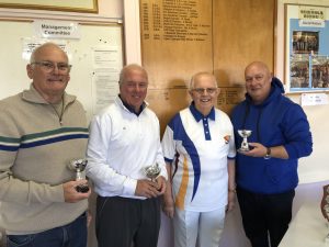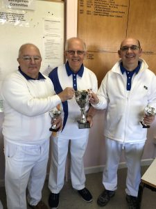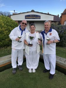 Congratulations go to the winners of Triples Competition: Rita Dibble, Alfie Dibble and Paul Finch. Runners-up Keith Jephcott, Geoff Fewings and Derek Brock. Pairs winners: Paul Finch and Roger Keen. Runners-up Richard Luscombe and Phil Baker. Singles winner: Roger Keen. Runner-up Jim Bass.